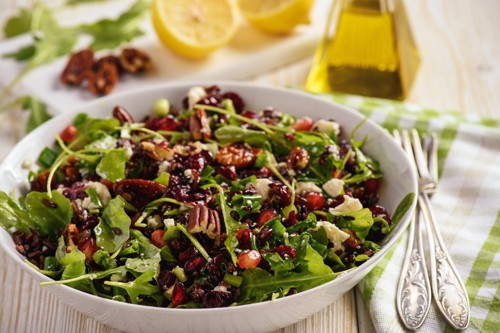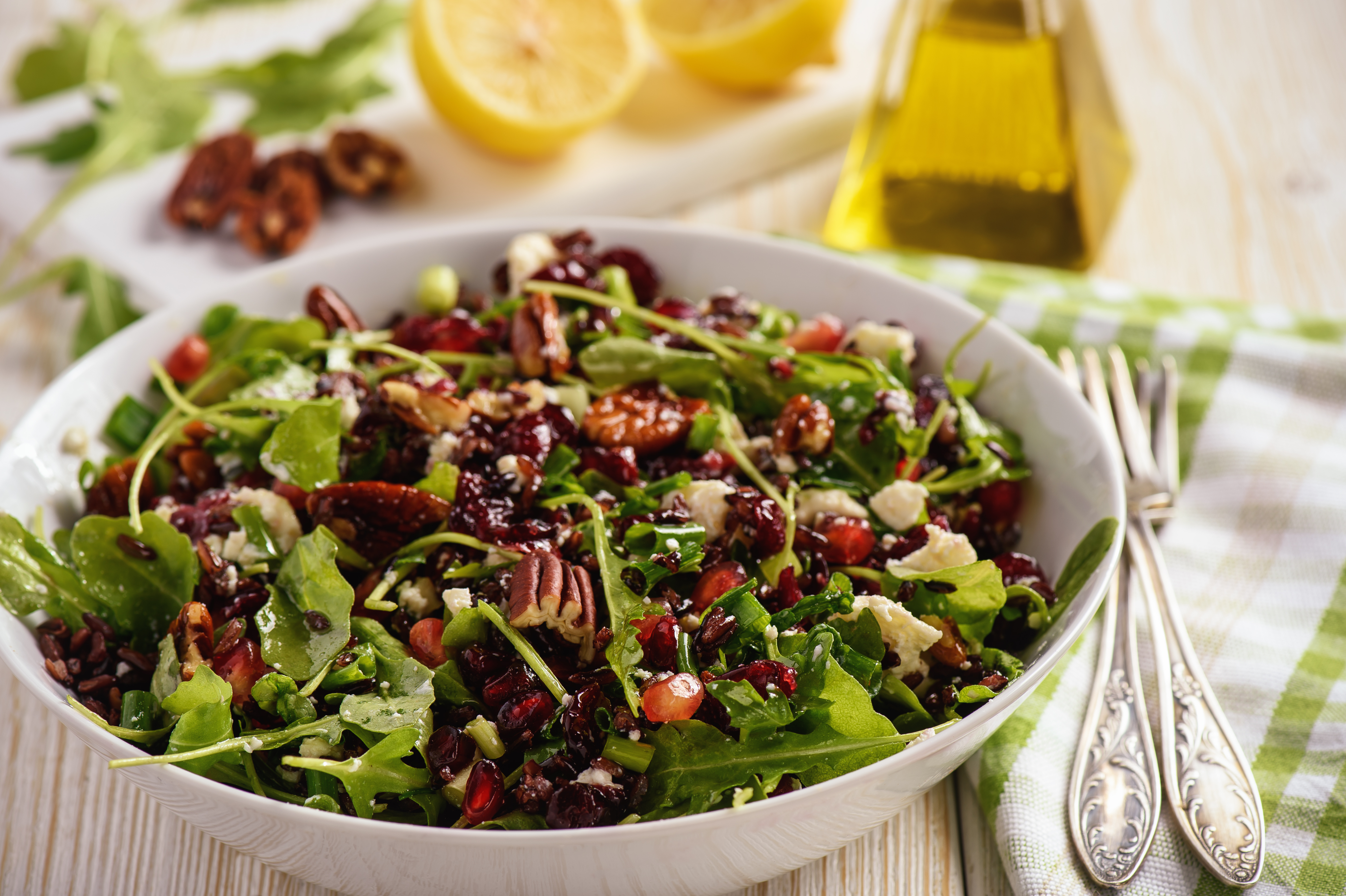 - Bland salat, løk, granateple og smuldret feta i en stor bolle.